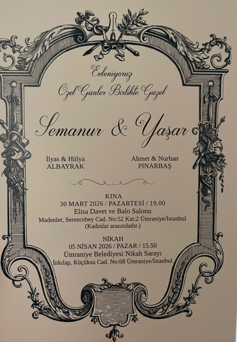 Kızımın bu mutlu gününde siz kıymetli akrabalarımıızı ve dostlarımızı aramızda görmek bizleri onure edecektir. 05.04.2026 Pazar günü Saat 15.50'de Ümraniye Belediyesi Nikah Sarayı'nda.